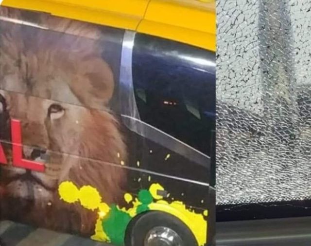 الحافلة تعرضت للرشق بالطوب حيث تحطم زجاجها الأمامي، ثم استكملت أحداث الشغب داخل الملعب.
