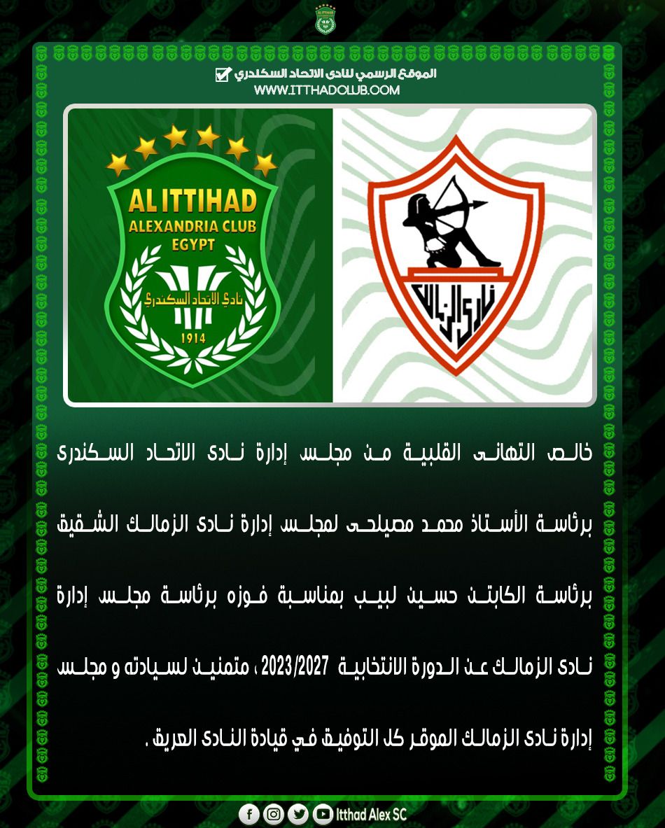 أرسل الأستاذ محمد مصليحي رئيس نادي الاتحاد السكندري برقية تهنئة إلي مجلس إدارة نادي الزمالك الجديد بقيادة الكابتن حسين لبيب متمنياً لهم التوفيق والتميز في قيادة أحد أهم قلاع الرياضه المصرية والعمل على رفع شأن الرياضه المصرية في كافة الألعاب الجامعية والفردية و باتصل هاتفي أكد لبيب أن عمق العلاقات والروابط بين الناديين عبر التاريخ متميزة يسودها الحب والاحترام المتبادل و انه يكن التقدير لنادي الاتحاد السكندري الذي يعد أهم قلاع الرياضه المصرية صاحب الشعبية الجارفة مؤكداً أن القادم بين الناديين الكبيرين والجماهير العظيمة هنا وهناك يؤكد ذلك عبر المنافسة الشريفة خلال العهود السابقة ومن ناحية أخرى ابدي مصيلحي عدم رضاه علي أداء فريق الكورة بعد أن وفر للفريق كافة الدعم والمساندة وعليهم أن يدركوا أنهم قادرون على إسعاد الجماهير التي لا تترك الفريق خلال الترحال وتتكبد مشقة السفر من أجل الكيان والعودة إلى مكانتة الطبيعية ولا يصح أن يكون سيد البلد رد فعل خلال مباراتين متتاليتين ومن جانبه أكد الكابتن طارق العشري بأن الإصابات وعدم إكتمال اللياقة البدنية لبعض اللاعبين أثر على الفريق ولكن الأمور تكتمل خلال اللقاء القادم وتعهد الجميع على إسعاد الجماهير العاشقة لسيد البلد في ظل المنافسة الشرسة بين اغلب الفرق هذا العام بالدوري الممتاز وأكد العشري بأن هناك تدريبات خاصة لكافة لاعبي خط الدفاع حيث أن أغلب الأهداف داخل عرين سيد البلد أتت بأخطاء لا تليق بسوء التغطية و التمركز لبعض اللاعبين ويعمل على ثبات التشكيل بعد عودة المصابين إلي الفريق