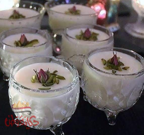 في قدر علي النار نقوم بوضع دقيق الارز والسكر ونحرك جيدا ثم نضيف اللبن بالتدريج وبعدها نضيف المستكة المخلوطة بالسكر ونقلب جيدا حتي نحصل علي قوام ثقيل ثم نصبها في أكواب وأطباق التقديم وندخلها الثلاجة ثم نزينها حسب الرغبة وتقدم