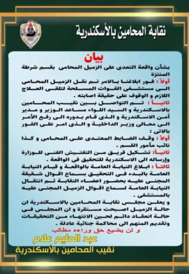 بشأن واقعة التعدي على الزميل المحامي بقسم شرطة المنتزة.