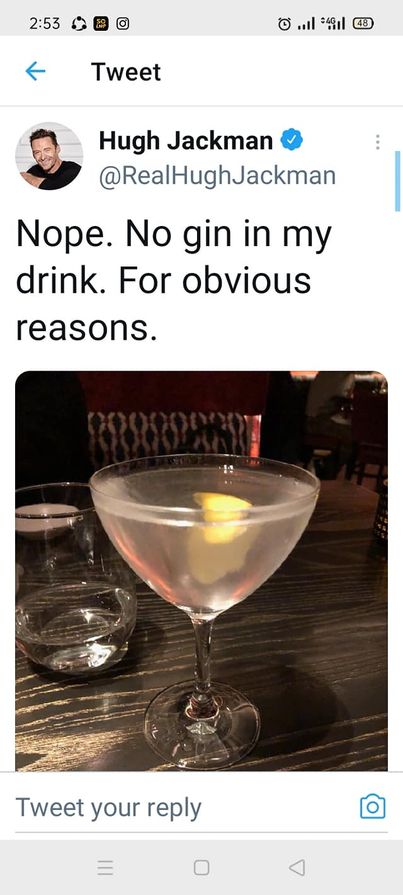 غرَّد النجم العالمي هيو جاكمان على حسابه الشخصي تويتر قائلاً ” لا. لا الجن في شرابي. لاسباب واضحة.”