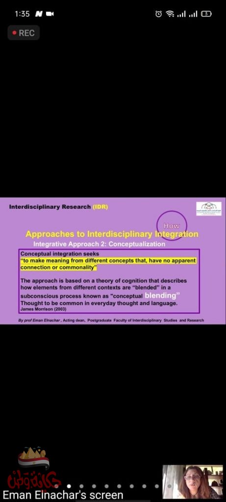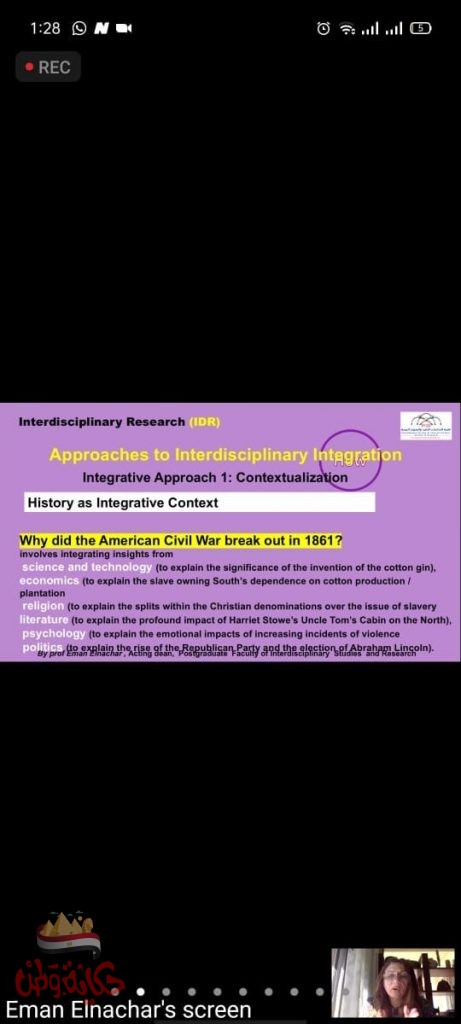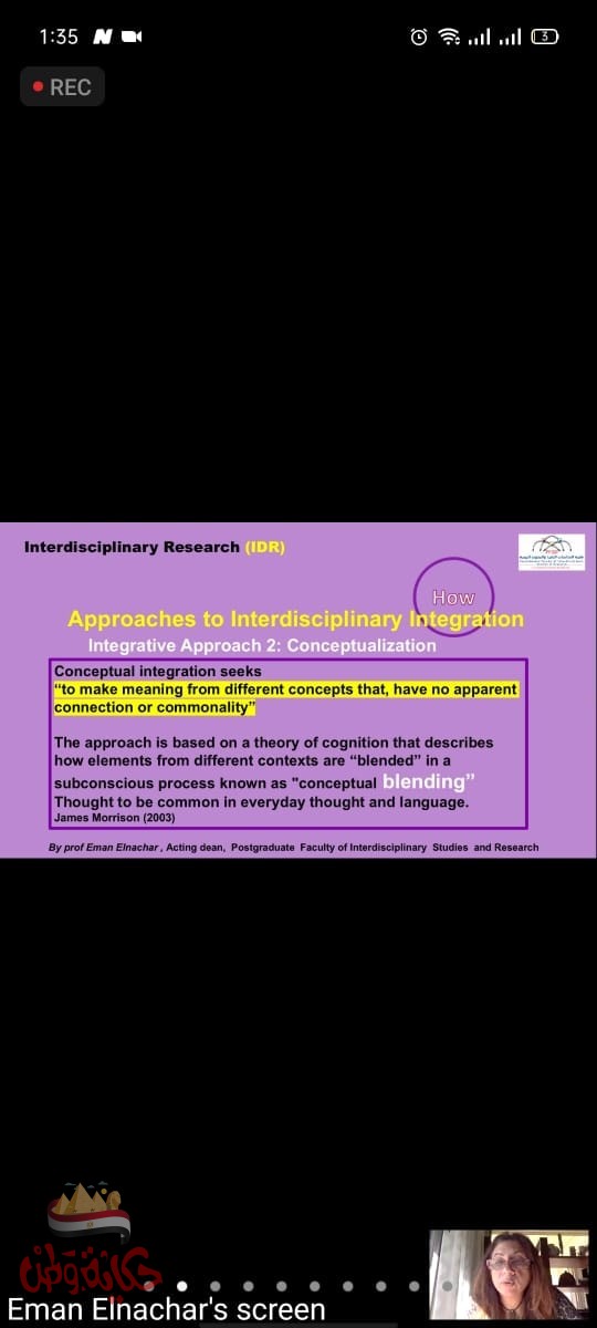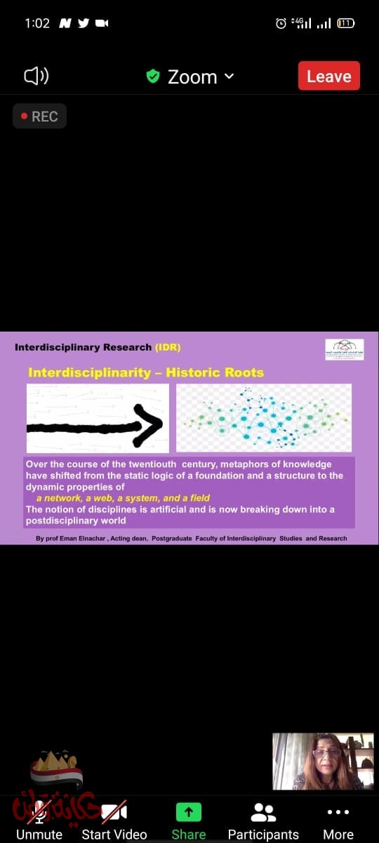 وعلى مدار محاضرتين قدمت الاستاذة الدكتورة إيمان النشار تناول لاهم خصائص وسمات ومنهجيات البحوث البينيه، حيث قدمت المحاضره الأولى مقدمه عن الجذور التاريخيه للفكر البينى فى التعليم والبحث العلمى وأهم العوامل التى أدت إلى انتشار هذا الفكر مع أواخر القرن العشرين . كما تم عرض احتياجات سوق العمل من خريجين لديهم مهارات التعليم والبحث العلمى البينى كمتطلب أساسي فى القرن الواحد والعشرين، كما تم إيضاح التعريفات الأساسية للدراسات البينيه وأهم خصائصها.