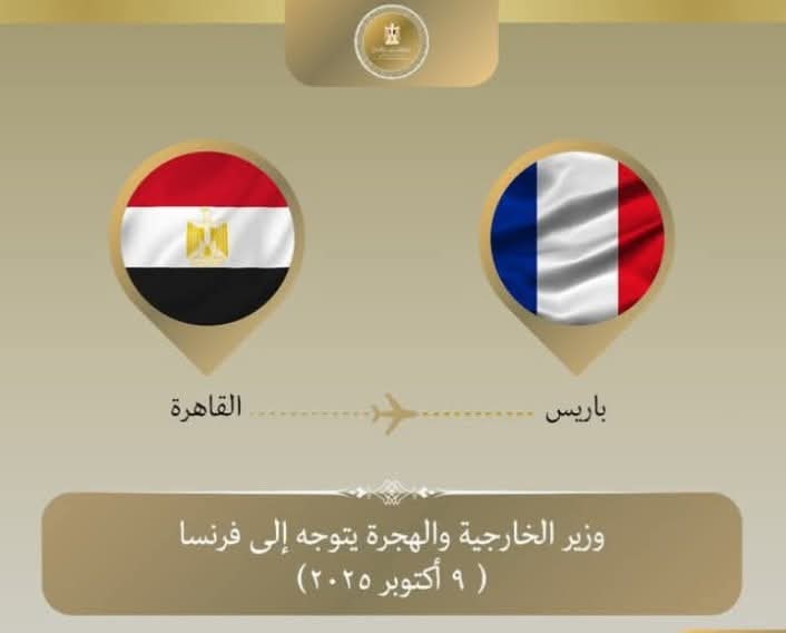 توجه د. بدر عبد العاطي وزير الخارجية والهجرة وشئون المصريين بالخارج يوم الخميس ٩ أكتوبر إلى العاصمة الفرنسية باريس، للمشاركة في الاجتماع الوزاري الذي دعا إليه الجانب الفرنسي لمناقشة ترتيبات الأوضاع فى قطاع غزة فى ضوء التطورات الإيجابية الأخيرة فى شرم الشيخ، وما تشكله من لحظة فارقة فى الحرب فى غزة.